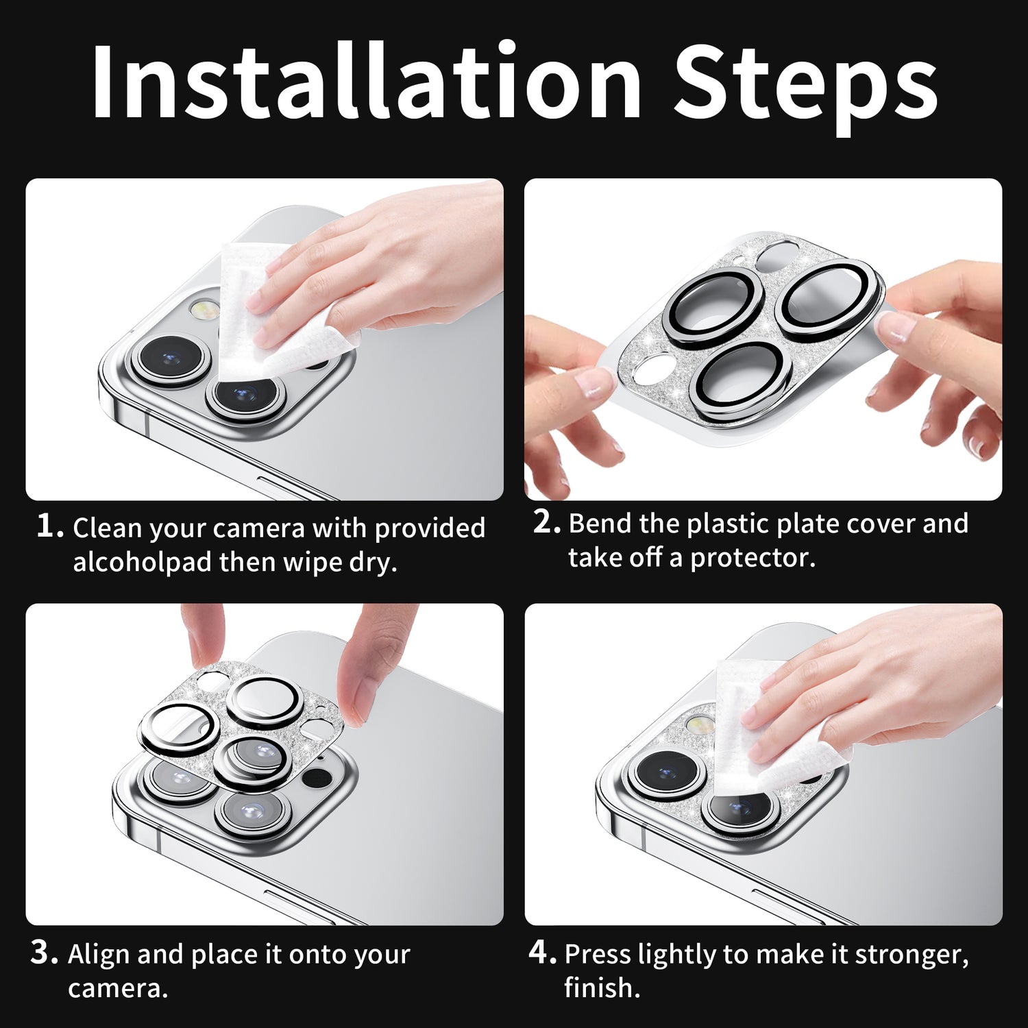 - [Easy to Install] No tools needed. Just match the protector with the phone camera lens, then stick on the protector and press it securely,the powerful glue will secure the protector on it will not slide off easily. If the lens cover for your phone fell off/broken,please feel free to contact us. Then we will resend a new one to you.